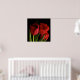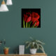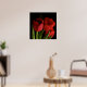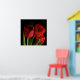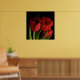 Este magnífico poster cuenta con un ramo de tulipanes rojos escarlata y hojas verdes sobre un fondo negro puro.