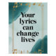 "Transformar vidas con tus palabras Nuestras letras pueden cambiar vidas poster celebra el profundo impacto de tu creatividad. Este diseño motivacional sirve como recordatorio de que sus letras tienen el poder de inspirar, curar y unirse. Perfecto para compositores, poetas y soñadores, te anima a crear palabras que resuenen profundamente y marcan una diferencia. Imprimido en materiales de primera calidad con imágenes dinámicas y de alta calidad, este poster es una bella adición a estudios, espacios creativos o a cualquier lugar de flujo de inspiración. Un regalo meditado para los que convierten las emociones en arte —que esta pieza te inspire a escribir letras que dejan un legado duradero".