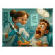 In einer kühlen, sterilen Praxisumgebung steht eine Zahnärztin mit ruhigem Lächeln und überdimensionalem Bohrer bereit – ganz die Gelassenheit in Person. Der Patient im Behandlungsstuhl dagegen klammert sich panisch an die Armlehnen, die Augen weit aufgerissen, der Mund geöffnet wie in einem stillen Schrei. Im Hintergrund prangen sterile Instrumente und ein aufmunterndes Poster. Ein plastisch überzeichnetes Bild, das mit Humor genau das einfängt, was viele beim Zahnarzt denken, aber nie aussprechen.