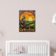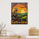 Este cuadro vibrante presenta un mapache con una piel blanca y marrón esponjosa y una mirada curiosa, encaramada en un escaparate rocoso. Detrás del mapache, una puesta de sol estilizada ilumina un valle verde rodante bajo un naranja texturado y un cielo amarillo. La obra de arte tiene un estilo grueso y de diseño con pinceles audaces y texturados. El texto "Cute pero salvaje" está pintado en un tipo de letra amarillo estilizado en la parte inferior de la imagen.