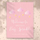 Perfecto para dar la bienvenida a amigos y familiares a una niña especial rociada, ducha o duchas de parejas. Con sus bonitas nubes rosas y sus estrellas doradas en las cuerdas, en un suave fondo rosado, esta señal de bienvenida de bonito es perfecta para todas las niñas pequeñas que están en camino. Diseñado por Thisisnotme©