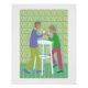 Poster met afbeelding van 2 mannen, die een goed gesprek voeren, met een drankje. Kleuren variaties van groen, blauw en rood
