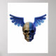 This artwork presents a human skull that is distinctly divided into two color tones: one half is a warm brown, while the other is a cool blue. Attached to the skull are a pair of stylized blue wings. The contrasting colors and the addition of wings create a surreal and symbolic image, possibly representing duality or transformation.