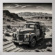 Un camión en un desierto con dibujos de carbón vegetal en las montañas.