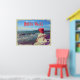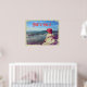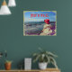 Un poster de aspecto vintage con una niñita con un gorra rojo y un vestido rosa y la playa (Pwllheli, Gales del Norte).