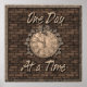 Muro de edad con un reloj viejo y las palabras Un día a la vez. Este lema se escucha a lo largo de los 12 programas de recuperación. Este lema de recuperación está disponible en camisetas, sudaderas, pezuñas en muchos colores y estilos para hombres y mujeres. Mira las tarjetas, tazas, gorras, totes de lienzo y artículos de regalo disponibles con este lema de recuperación.