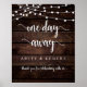Moderna cabaña rústica con luces de cuerda, Un día para la boda, Cartel de bienvenida a la cena de ensayo de la boda, en letras blancas.