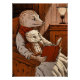 L'image montre une scène chaleureuse de deux furets, un adulte et un jeune, assis dans un fauteuil en bois. Le furet adulte, portant une écharpe rouge et blanche, tient un grand livre à reliure rouge, tandis que le plus jeune, portant des lunettes, est confortablement assis sur ses genoux. La pièce est faiblement éclairée par une lampe posée sur une table d'appoint, projetant une lueur chaleureuse sur la scène.