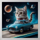 Un gato con gafas conduciendo un auto en una carretera con planetas.