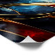Retrato lateral de un caballo impresionante de estilo abstracto. Esta obra de arte presenta una técnica artística de vidrio manchado con líneas doradas, llenas de vibrantes tonos rojos, azules, naranjas, negros y plateados sobre un fondo oscuro. El resultado es una majestuosa representación de un stallión que exuda esplendor regal.