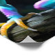 Un reptil de colores vivos que mezcla tonos verdes, azules, amarillos y rosas está encaramado sobre un trozo de madera que sobresale sobre un fondo oscuro y borroso. Las escalas detalladas y los ojos llamativos realzan el aspecto cautivador de la criatura.