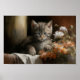 Añade este precioso gatito a tu pared para garantizar una sonrisa cada día. "A Cosy Corner" es un cuadro con un bonito gatito de mesa gris que se asoma en la parte de atrás de una silla, que mira un acuerdo de flores blancas y naranjas sentado en una mesita al lado de la silla. La piel del gatito es suave y esponjosa, y sus grandes ojos redondos están llenos de curiosidad y asombro. Los tonos cálidos y tierra le dan un toque acogedor y acogedor. Las flores están pintadas con colores vivos, lo que las hace aparecer en el fondo oscuro. El conjunto de la pintura es tranquilo y apacible, invitando al visitante a relajarse y disfrutar de la sencillez de un acogedor rincón con un amigo felino.