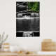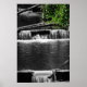 La foto en blanco y negro de un pequeño río y una cascada muestra un toque de verde en las hojas que cuelgan encima.
