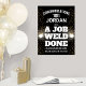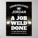 Agrega un toque personalizado y elegante a las decoraciones de la fiesta de graduación de soldadura con el cartel personalizado "A Job Weld Done". Todo el texto en esta plantilla de cartel es fácil de personalizar. El diseño en negro y blanco presenta una antorcha de soldadura con chispas, una mortaja de acero inoxidable falsa y tipografía moderna y negrita para el nombre del graduado, año de graduación y escuela. Tenga en cuenta que el gorro de graduación plateado es de color impreso, no de lámina metálica. El diseño de la cita divertida y elegante hace una adición divertida y única a la celebración de graduación de un soldador. ¡Felicitaciones al graduado!