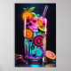Una copa de cóctel vibrante se llena de frutas coloridas, brillando en tonos neones. Alrededor del vidrio hay frutas enteras, como toronjas y cerezas, que aportan un toque fresco a la composición.