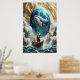 Un cuadro surrealista que representa a un pescador en un pequeño barco, tambaleándose en una ballena azul gigante conectada a una orilla azul agitada, todo ello con nubes doradas y olas dramáticas.