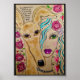 Una niña, su galgo, galgo, whippet, o iggy pintado sobre papel marrón en acuarela y tintas.
