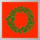 Diseño de la guirnalda común - Wreath sobre fondo rojo. Ilex aquifolium, el holly, holly común, holly inglés, holly europeo, u ocasionalmente Navidades holly, es una especie de planta floreciente en la familia Aquifoliaceae. Diseño festivo decorativo.