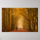 Impresión poster de una mujer dando un paseo con su perro a través de la niebla matutina en un camino en un bosque de hayas en colores otoñales.