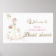 Una encantadora pancarta recubierta por encima de la entrada, saludando cálidamente a todos los invitados con ‘Bienvenidos a la ducha de novias’ en un elegante guión -marcando el tono de un día lleno de amor y celebración."