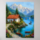 La imagen es un cuadro de una pequeña casa con techo de tejas rojas. La casa se encuentra a orillas de un lago, con una pequeña isla delante. La isla está rodeada de exuberante vegetación y flores de colores, y hay varios botes pequeños amarrados en el agua. En el fondo, hay montañas y un cielo azul claro. El ambiente general de la imagen es tranquilo y sereno.