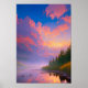 Esta obra de arte digital captura la serena belleza de una majestuosa puesta de sol sobre un río tranquilo que pasa por el bosque. La puesta de sol se oculta detrás de las nubes, creando un impresionante conjunto de tonos morados y rosas que llenan el cielo. Las tranquilas aguas del río y la exuberante vegetación del bosque crean un entorno tranquilo e idílico. Esta obra de arte captura la esencia de la belleza y la serenidad de la naturaleza.