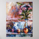 Un jarrón con flores, frutas (un naranja, un melocotón y una ciruela) y un cántaro azul y blanco - todo desde la cocina de mi amigo en Rusia.