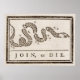 El personalizado de serpientes "Únete o muere", un poderoso símbolo de unidad, fue creado por Benjamin Franklin en 1754. Surgió en una época de creciente tensión entre las colonias británicas en Norteamérica y los franceses y sus aliados nativos estadounidenses. - La guerra francesa e india se avecinaba y Franklin, delegado en el Congreso de Albany, reconoció la necesidad de una unidad colonial para contrarrestar eficazmente la amenaza combinada. Vio la naturaleza inconexa de las colonias como una gran debilidad, que entorpecía su capacidad de montar una defensa coordinada. - Inspirándose en diversas fuentes, entre ellas un proverbio francés y ilustraciones de historia natural, Franklin diseñó la imagen de "Unirse o morir". La serpiente cortada, dividida en ocho segmentos que representan a las colonias, sirvió como una advertencia severa. Transmitió el mensaje de que si las colonias seguían divididas, serían vulnerables a los ataques y, en última instancia, perecerían. - El personalizado fue publicado en el periódico Franklin, The Pennsylvania Gazette, el 9 de mayo de 1754. Rápidamente ganó atención y provocó un debate entre los colonos. Algunos lo vieron como un llamado a la acción, instándolos a unirse para su supervivencia. Otros la calificaron de alarmista e innecesaria. - Aunque el Congreso de Albany no logró su objetivo de establecer un gobierno colonial unificado, el personalizado "Únete o muere" dejó un impacto duradero. Se convirtió en un poderoso símbolo de la unidad colonial y presagió la eventual unión de las colonias durante la Revolución Americana. - La serpiente "Únete o muere" reaparecería luego durante la Guerra Revolucionaria, recordando a los colonos la importancia de su fuerza colectiva. Sigue siendo reconocida como una pieza significativa de la historia estadounidense, representando los primeros llamados a la unidad que en última instancia condujeron al nacimiento de una nación.