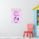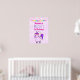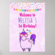 Poster de cumpleaños con un caprichoso dibujo de un unicornio chubino rosa fresco y funky que tiene una forma y un cuento morado. Esta criatura linda lleva gafas de sol en forma de corazón y está decorada con pequeñas estrellas. Fondo de color de agua rosa. Confeti colorido y un cartel de aferrarse en la parte superior.