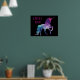 Una silueta colorida de un unicornio mágico en tonos azules y violetas se personaliza con tu nombre y la palabra Room con una fuente de moda rosa brillante. El fondo es negro para mostrar tu nombre y la imagen. Con las herramientas de edición en pantalla puede cambiar fácilmente el color del tipo de letra, el estilo y el tamaño del tipo de letra para crear su propio poster único para su dormitorio o dormitorio.