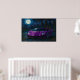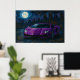 A sleek purple Lamborghini Aventador commands the foreground of this moonlit urban dreamscape, its aerodynamic silhouette bathed in soft lunar glow. Parked on a shadowed city street beneath a star-strewn sky, the car’s gleaming surface reflects the distant skyline—tall buildings silhouetted against the night, their windows flickering like constellations. The full moon looms large, casting a silvery light that dances across the pavement and accentuates the car’s sharp contours and luminous headlights.