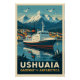 Poster de viajes retro vintage de Ushuaia, Argentina, con un barco de expedición que se prepara para partir del puerto hacia la Antártida. Primer plano: gran navío blanco y rojo de expedición con líneas limpias y audaces, atracado cerca del colorido frente de Ushuaia. extremo de la ciudad mundial