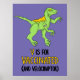 Let the world know that you're vaccinated with this fierce dinosaur. This poster features an illustration of a velociraptor in bright green with a bandage on his arm where he got his shot above the message "V is for Vaccinated (and Velociraptor)” all set against a purple background.