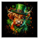 La vaca de Cute Highland se vistió para el Día de San Patricio en un gorra y una bufanda con shamrock.