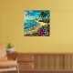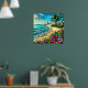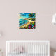 ¡Aloha! litoral costero tropical bonito. agua azul bonito, palmeras, flores tropicales y un faro al fondo. Ai arte hecho en un estilo de arte pop de historietas.