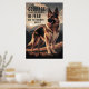 Un Pastor Alemán se erige alto y orgulloso en medio de una puesta de sol en las montañas. La cita Valor no es la ausencia de miedo, sino el triunfo sobre él se muestra sobre el perro.