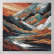 Un paisaje montañoso surrealista con un río sinuoso bajo un cielo naranja, que presenta rocas en tonos terrosos, blancos y azulados, y una paleta de colores rica y vibrante.