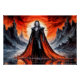un vampiro en un paisaje oscuro y polvoriento bajo una luna roja, con murciélagos volando y castillos en el fondo.