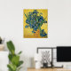 "Iris" (mayo de 1889) de Vincent van Gogh muestra una bella vida quieta de un vibrante ramo de iris en un jarrón amarillo. El fondo es amarillo intenso y cálido, lo que contrasta con los tonos azules de las flores. Los iris, en varios matices de azul, son el punto central de la composición, sus pétalos delicados se despliegan en flor. El jarrón, un recipiente amarillo sencillo pero elegante, resalta aún más los colores vivos de las flores. La composición general refleja el característico y audaz trabajo de Van Gogh y la paleta de colores vivos, haciendo hincapié en la belleza de la naturaleza a través de los contrastes dinámicos.