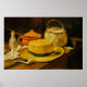 A straw hat sits on a wooden table surrounded by earthenware, a bottle, and a pipe. The composition features rustic and everyday items.