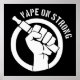 Un puño estilizado y rodeado de un borde con un modo de vapor, con las palabras estampadas "Vape On Strong" en un lado. Un mensaje a los compañeros que perseveran y luchan contra la negatividad con conocimiento e información.