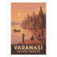 Afiche de viaje retro de Varanasi, India, que muestra el sagrado río Ganges al amanecer. Antecedentes: ghats a lo largo del río con botes pequeños y siluetas sutiles de personas actuando al atardecer