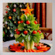A whimsical Christmas tree constructed from vibrant green lettuce leaves, artfully arranged and threaded onto a rustic wooden skewer. Miniature cherry tomatoes serve as festive baubles, while a bright red pepper, meticulously carved into a star shape, crowns the apex. Vegetarian food for Christmas dinner.