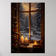 La "Noche de Invierno con un cálido Poster de la ventana iluminada por velas" transporta a los espectadores a una escena serena donde la tranquilidad de una velada nevada se ilumina con el suave resplandor de las velas. Esta fascinante obra de arte captura la esencia de la comodidad y la tranquilidad, invitando a los espectadores a abrazar la calidez y el confort de una noche de invierno. En esta encantadora representación, una pintoresca ventana enmarcada por cristales de escarcha ocupa el centro del escenario, emanando una luz suave y atractiva que se desliza hacia el paisaje invernal. En el exterior, los copos de nieve caen suavemente del cielo, cubriendo el suelo con una capa de blanco inmaculado. La escena transmite un sentimiento de paz y serenidad, ofreciendo un momento de reflexión y contemplación silenciosa en medio del ajetreo y el bullicio de la temporada de vacaciones. La historia que subyace a este diseño es de lo más simple y de lo más bonito que es encontrar un solárium en medio del frío del invierno. Capta la sensación de volver a casa en un santuario cálido y acogedor, donde la llama parpadeante de una vela proporciona un reconfortante faro de luz en la oscuridad. El trabajo de arte celebra la magia de las noches de invierno y el poder de los pequeños momentos para traer calor y alegría a nuestras vidas. Lo que hace a este poster especial es su capacidad de evocar una sensación de nostalgia y tranquilidad en los espectadores, transportándolos a un mundo de paz y serenidad. Sirve como recordatorio de la belleza que se puede encontrar en los momentos tranquilos de invierno, y de la importancia de ralentizar y saborear los placeres simples de la vida.
