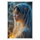 Un retrato mágico de alto perfil de una joven con los ojos suavemente cerrados, sus características bañadas en una contrastante iluminación de fantasía. La cálida luz naranja-dorada se eleva desde abajo, iluminando su barbilla y sus labios, mientras que los frescos tonos helados-azules descienden desde arriba, acariciando su frente y pómulos. Un velo azul brillante y brillante que cubre su cara, que brilla con un bordado delicado y brillante. Su piel brilla con polvo luminoso, mientras gotas de azul y oro se deslizan por el aire como estrellas suspendidas. Las avispas de humo se acurrucan con gracia a su alrededor, mezclándose con la escena de ensueño, mientras que los resplandecientes resplandecientes resplandecen sutilmente en el fondo borroso.
