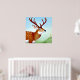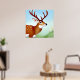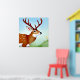 Ilustracion detallado de un ciervo con cuernos en un paisaje sereno y nevado con vegetación y setas.
