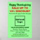 ¡Feliz Día de Acción de Gracias! Un feriado para celebrar y agradecer por las bendiciones que recibimos. También es una de las vacaciones para promocionar su negocio. poster de personalizable con la venta de Acción de Gracias, su nombre comercial y otra información. Poster que puede usar como material de marketing para atraer más clientes. Personalizar y úselo para convencer a más clientes de que compren sus productos o clientes para que les gusten sus servicios este día de Acción de Gracias. Los colores de diseño son textos de color verde oscuro y rojo sobre fondo verde claro. Los contenidos son Feliz Día de Acción de Gracias, venta de textos con un porcentaje de descuento que ofrecerás, fechas de venta, tu nombre de negocio, logotipo, dirección, número de teléfono, correo electrónico y sitio web o tu página de medios sociales de negocios. Compruebe la apariencia después de cargar el logotipo y escribir textos. Si la apariencia le resulta agradable, puede realizar su pedido ahora. Si necesita redimensionar y mover el logotipo y los textos para que encajen en este poster o en el tamaño y forma que elija, por favor cambie la herramienta de diseño. También puede realizar otros cambios en la herramienta de diseño según la apariencia de este poster que prefiera, como cambiar el color de fondo, el color del tipo de letra y el estilo del tipo de letra. ¡Feliz Día de Acción de Gracias! Te deseo más ventas esta fiesta.