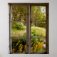 Flores amarillas, hierba verde y árboles. Bonita naturaleza fuera de una vieja ventana. Fotografía.