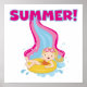 Un bonito diseño para el verano, con un chica de pelo rubio vestido con traje de baño y anillo que baja por el tobogán de agua y un texto rosa y azul caliente que lee VERANO! Camisetas de verano, bodysuit, bibs, tazas, tarjetas, bolsas, pegatinas, keepsakes, almohadas y mucho más.