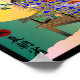 Esta vibrante obra de arte estilo bloque de madera japonesa presenta una impresionante fusión de arte tradicional ukiyo-e con el capricho contemporáneo, con un gato siamés vestido con un kimono ornamentado en azul real rico y rojo con intrincados patrones de oro. La escena captura un amanecer de verano o una puesta de sol, con la silueta del Monte Fuji pintada contra un cielo dramático pintado de rosados cálidos, naranjas y amarillos. El gato está representado en un momento de contemplación en una veranda de madera (engawa), vestida con un kimono elaborado decorado con motivos de nube y diseños geométricos. Al fondo, un pino tradicional extiende sus agujas esmeraldas por toda la escena, mientras que una pantalla decorativa o una partición con motivos geométricos audaces y una linterna colgante le dan profundidad a la composición. La obra de arte incluye elementos clásicos ukiyo-e como el cartuche amarillo en forma de ventilador en la parte superior izquierda que contiene caracteres japoneses, y un sello circular rojo con kanji en la parte inferior izquierda. La paleta de colores es particularmente llamativa, combinando tonos azules y rojos vibrantes del kimono con tonos cálidos de puesta de sol y un fresco fondo verde, creando una composición dinámica y armoniosa. Esta pieza equilibra magistralmente los elementos artísticos tradicionales japoneses con la interpretación moderna y lúdica. Los patrones detallados, la composición cuidadosa y los gradientes de color ricos demuestran una hábil artesanía, al tiempo que mantienen el capricho de su sujeto felino. El conjunto crea una sofisticada pieza que se sumaría a los espacios contemporáneos y tradicionales. La escena captura la serenidad de una velada de verano japonesa, a la vez que añade un toque imaginativo que la hace única y atractiva para las audiencias modernas.